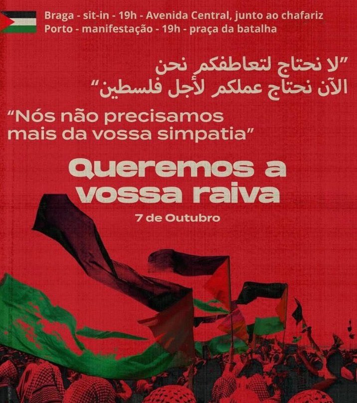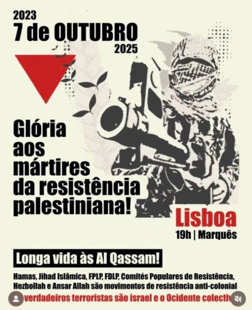 Foram divulgados nas redes sociais cartazes de manifestações para o dia de hoje, 7 de outubro, data em que se assinalam dois anos do início do conflito entre o Hamas e Israel.
