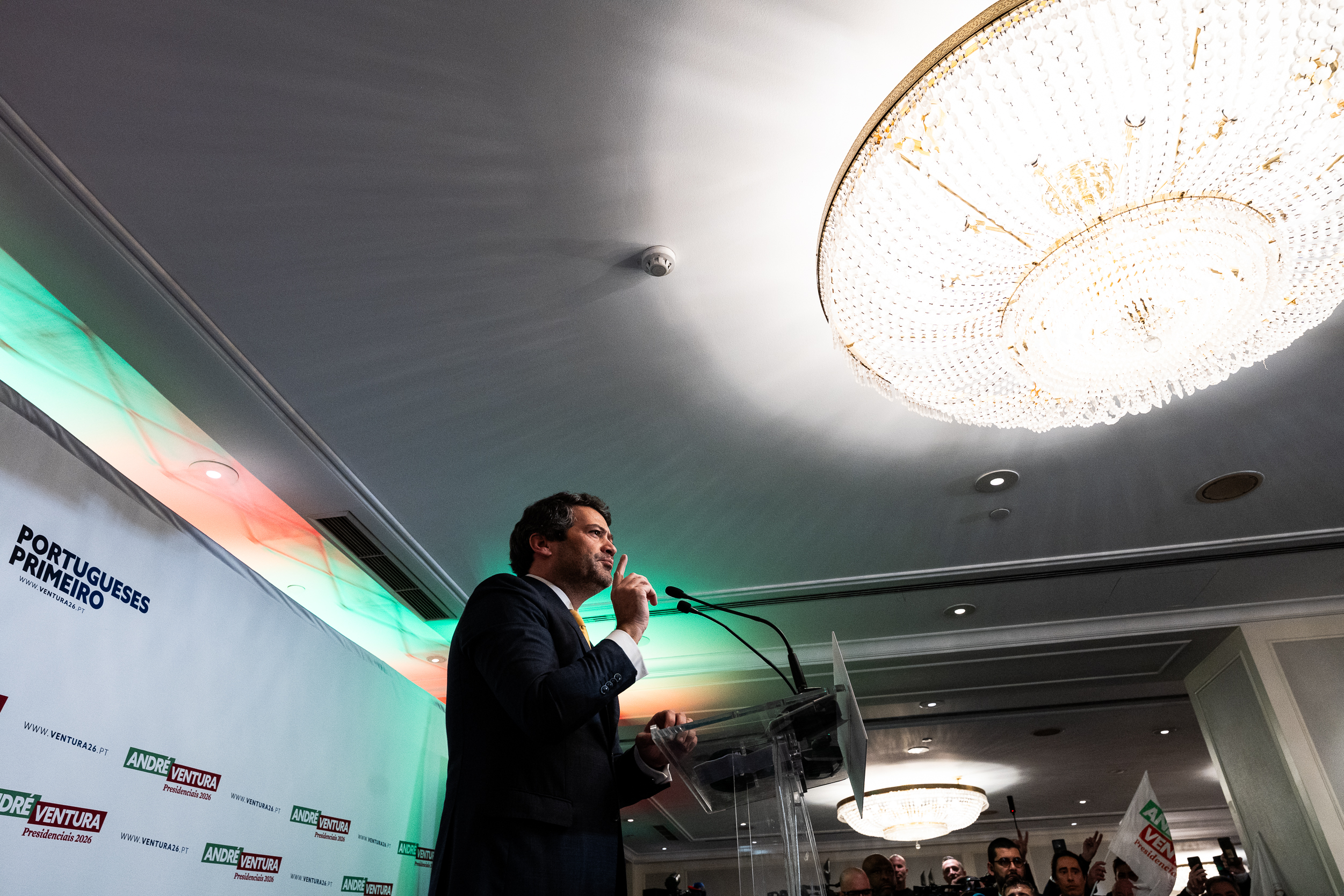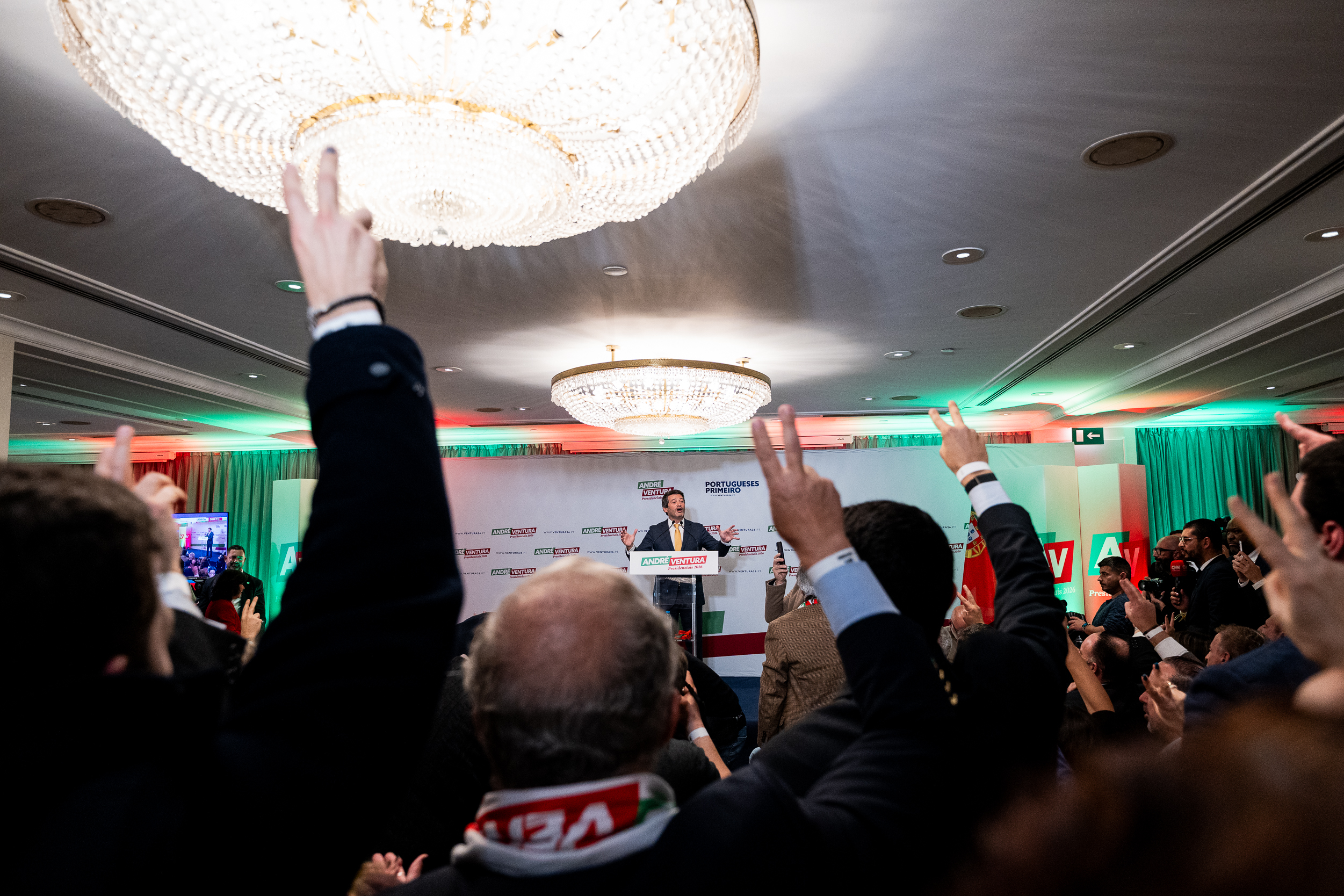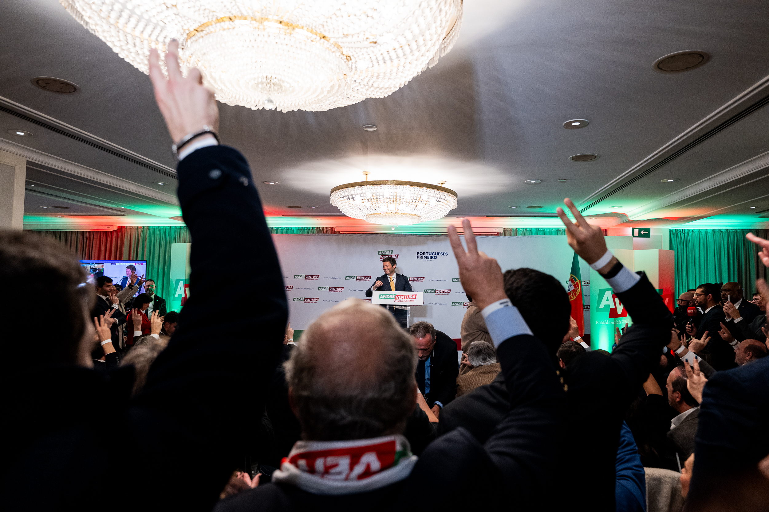 O tom foi de festa na hora (23h19) de discursar ao país. Gritos de “Portugal”, “Vitória” e cânticos de “8 de fevereiro, Ventura em primeiro (o candidato respondeu com o dedo indicador espetado)” serviram de combustão ao inflamável líder partidário e candidato que disputará a segunda volta das eleições presidenciais.