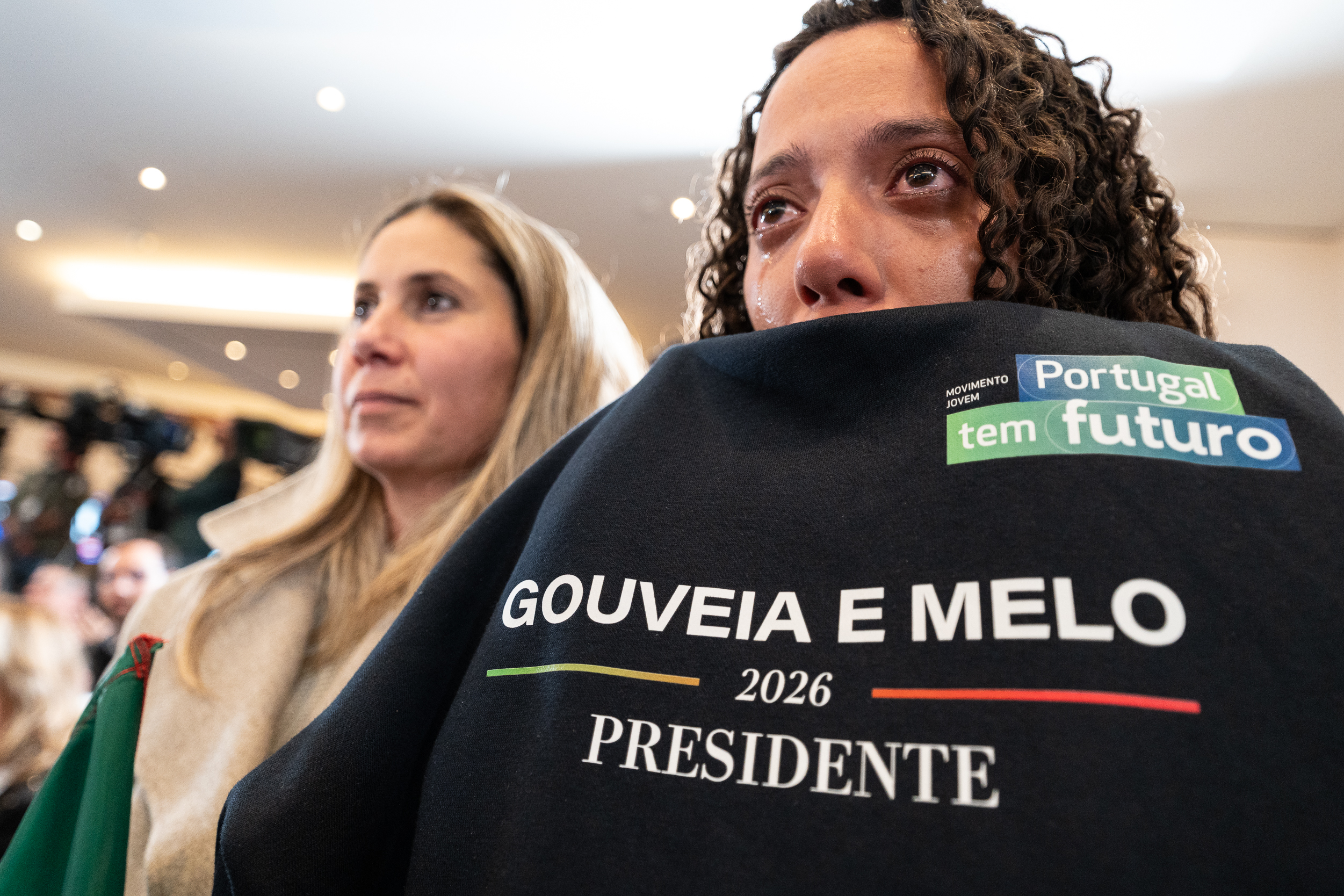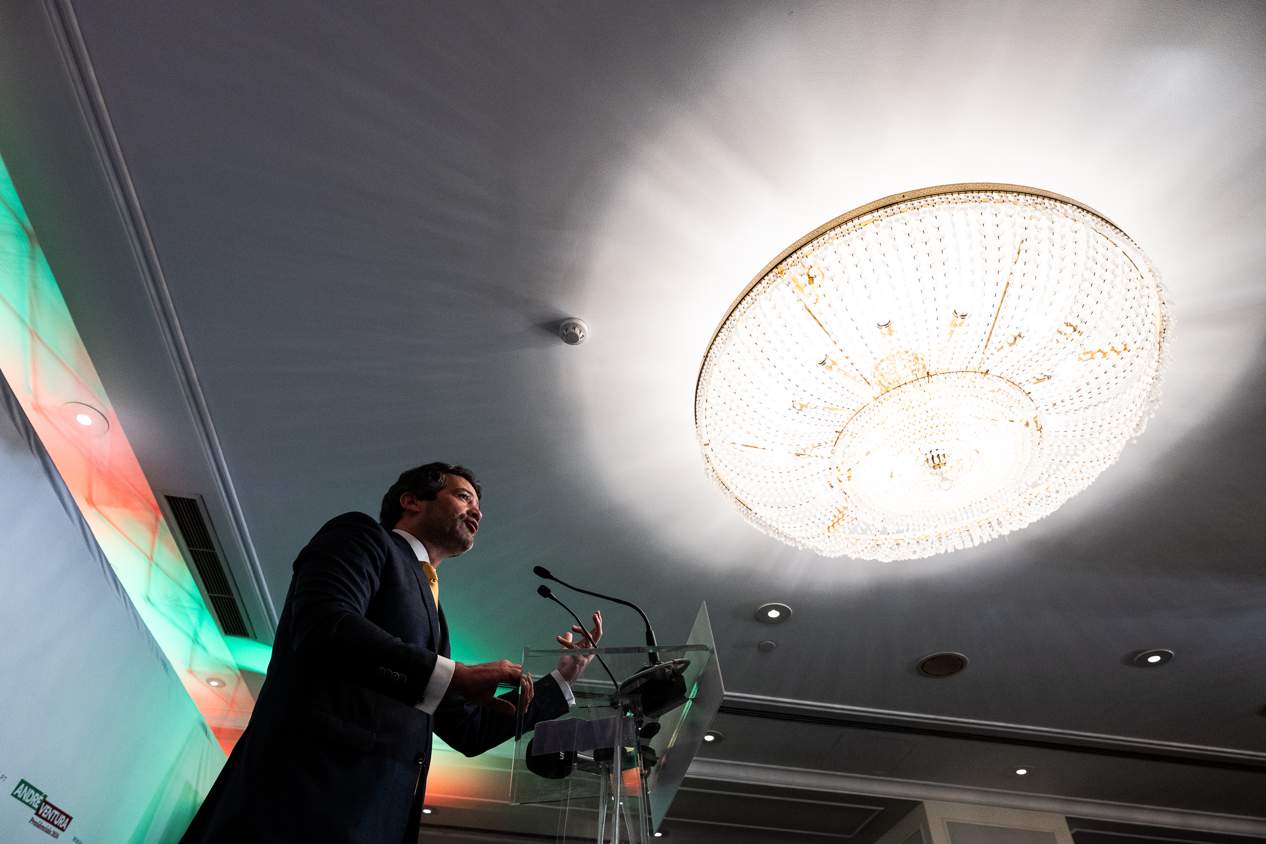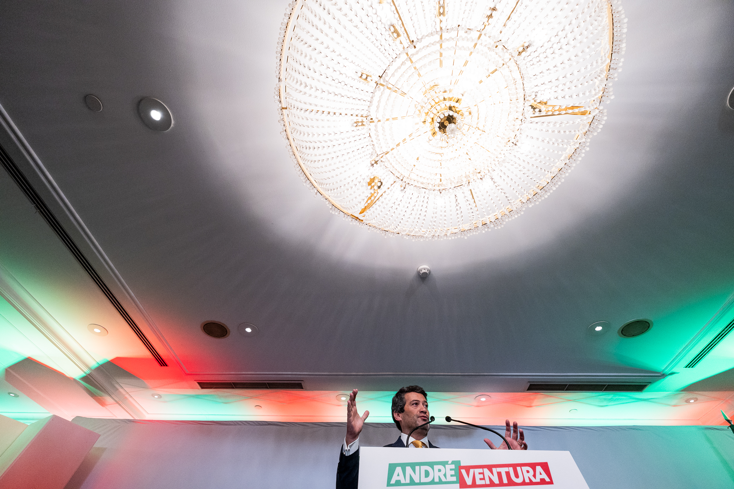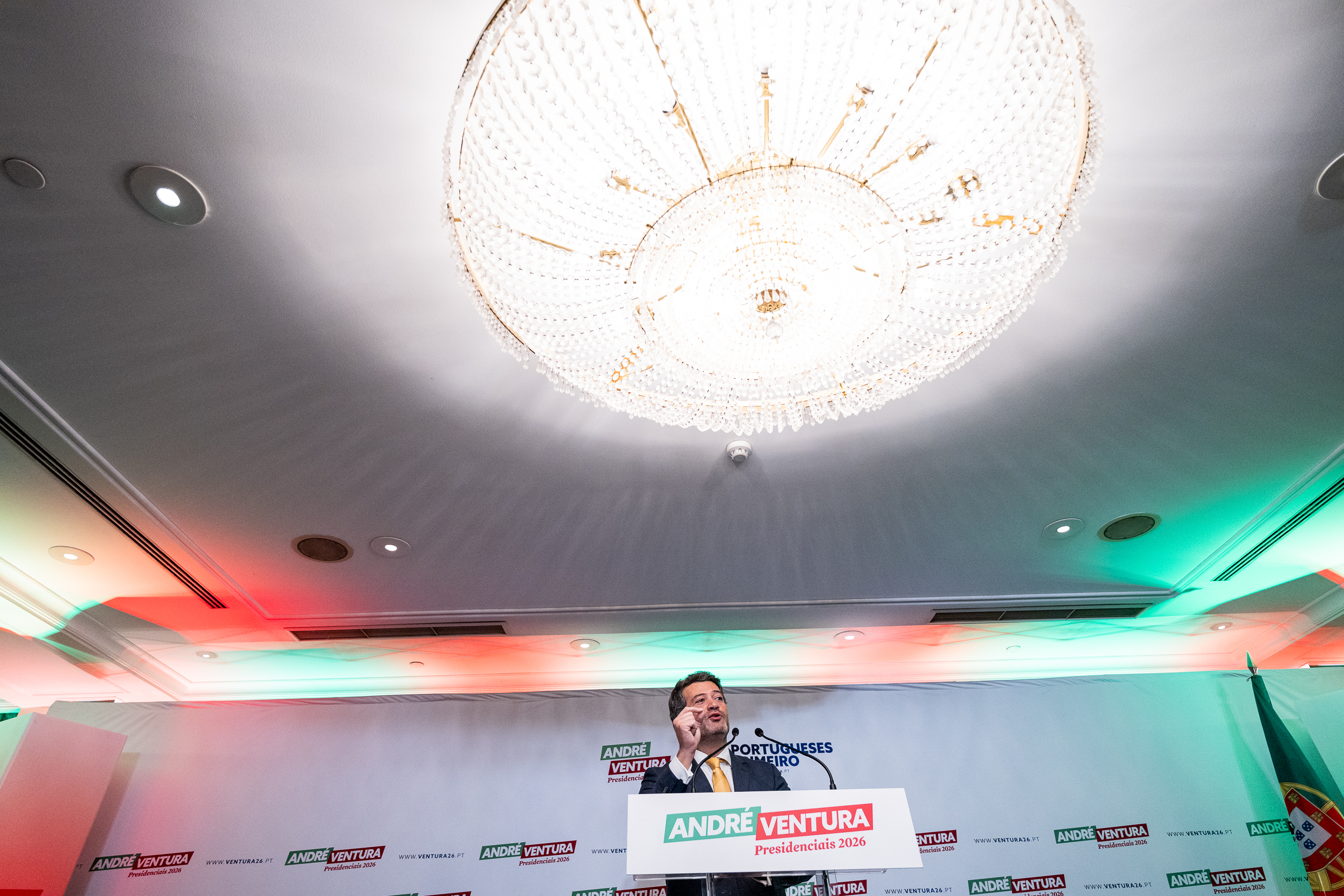 O tom foi de festa na hora (23h19) de discursar ao país. Gritos de “Portugal”, “Vitória” e cânticos de “8 de fevereiro, Ventura em primeiro (o candidato respondeu com o dedo indicador espetado)” serviram de combustão ao inflamável líder partidário e candidato que disputará a segunda volta das eleições presidenciais.