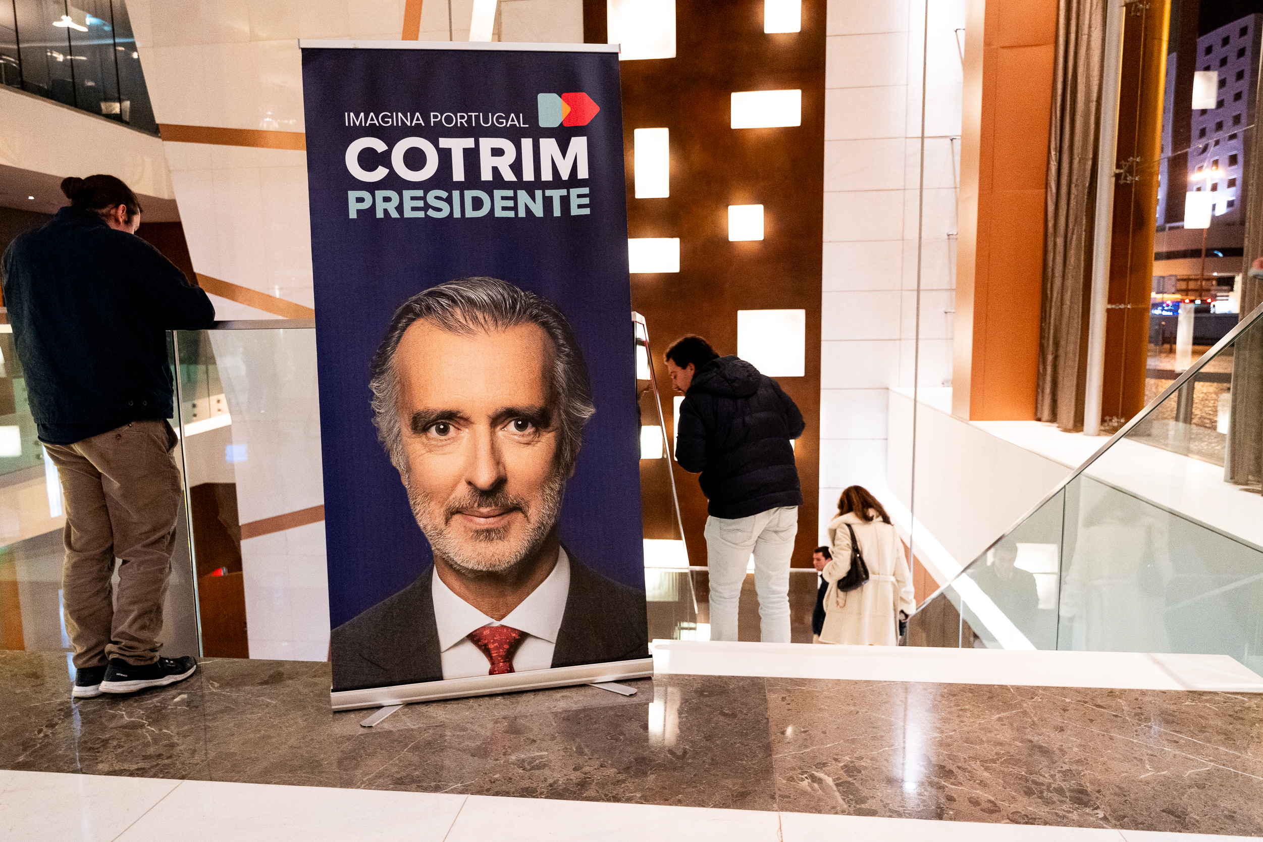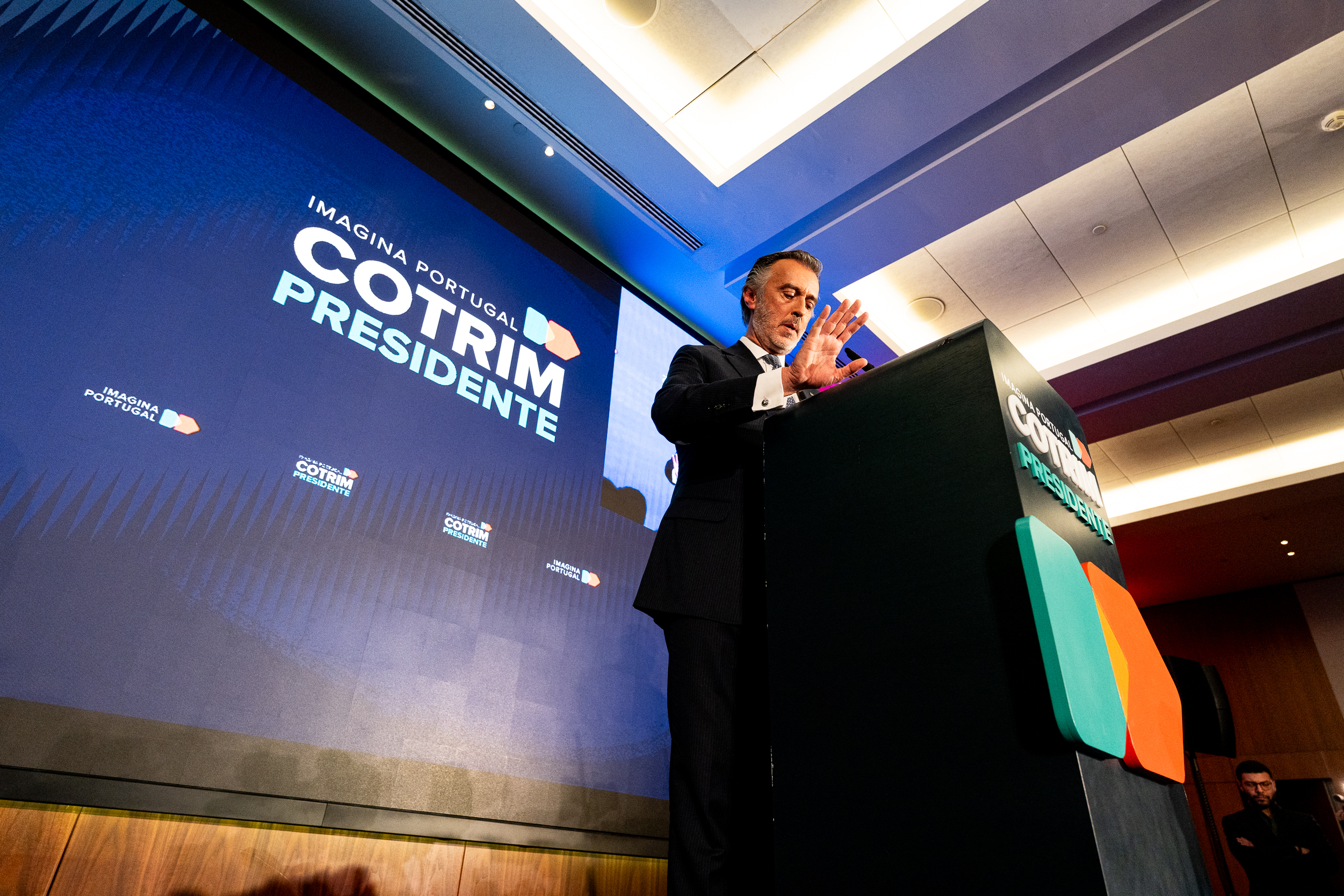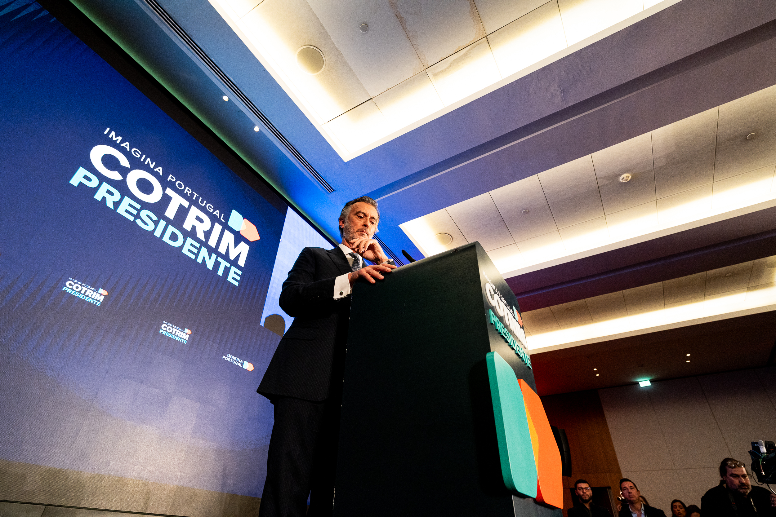 À frente de um, dos três, enormes plasmas e enquadrado (tons de azul) entre a frase “Imagina Portugal Cotrim Presidente”, lançou farpas ao campo político onde navega. A “provável” eleição de António José Seguro, uma “péssima escolha”, a par de André Ventura, tem um rosto e um nome. “Deve-se a um erro estratégico da liderança do PSD (assobios). Luís Montenegro não pôs o interesse do país à frente do seu partido”, disparou. Mais assobios.