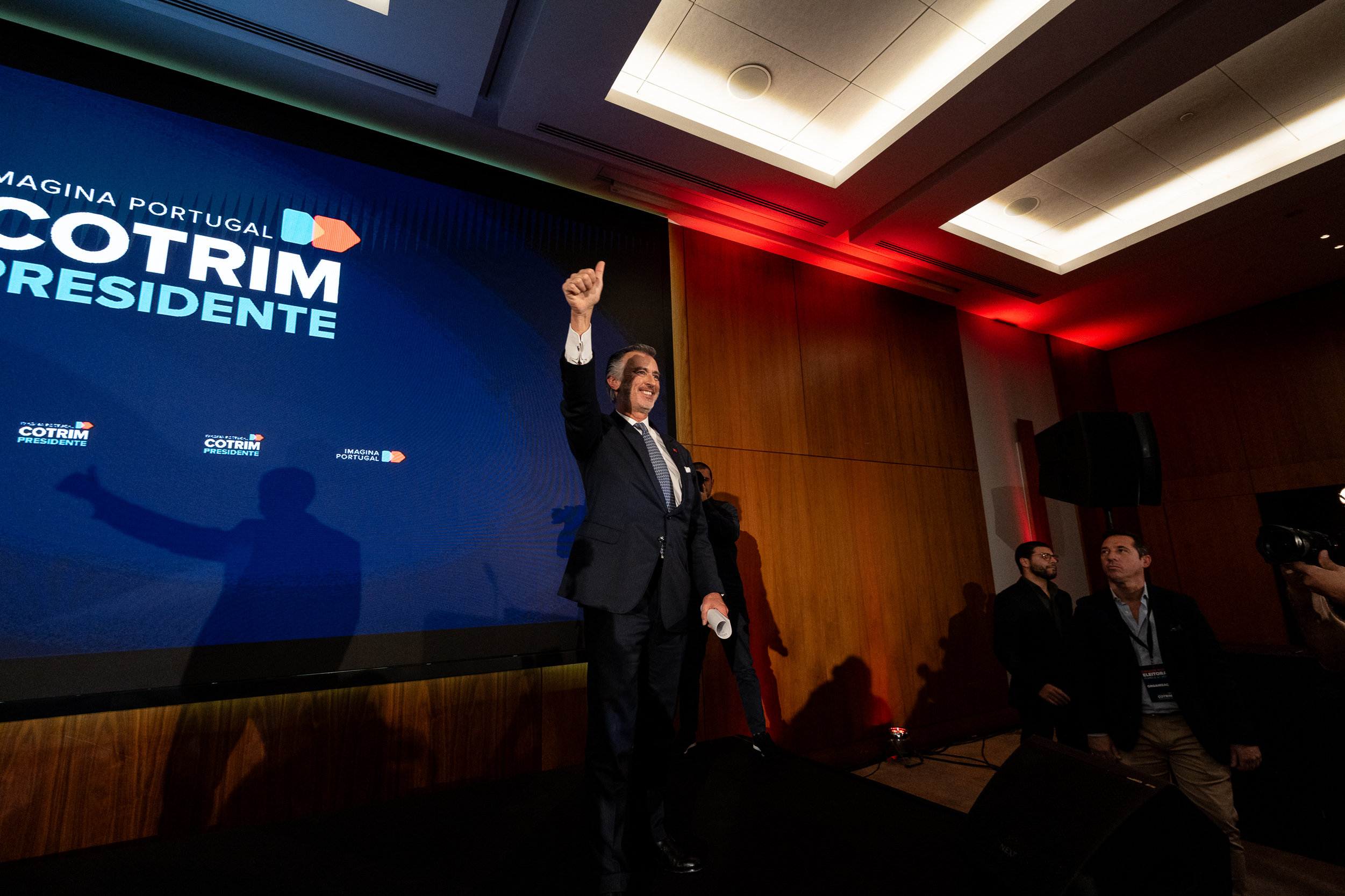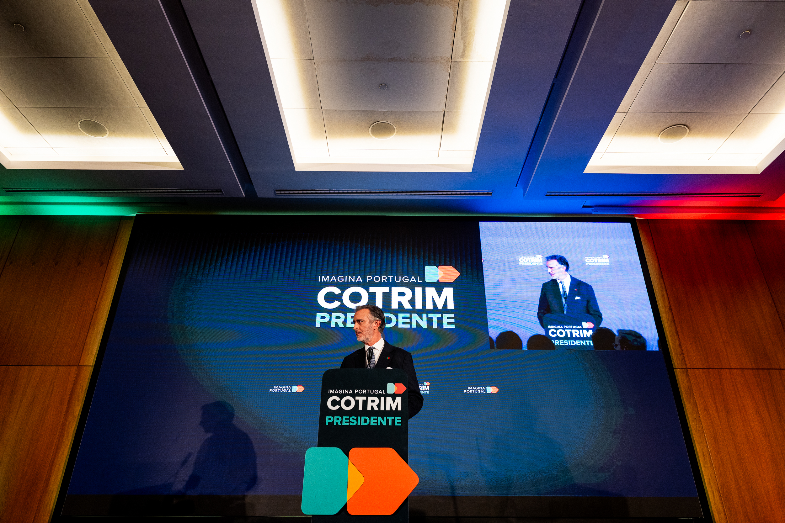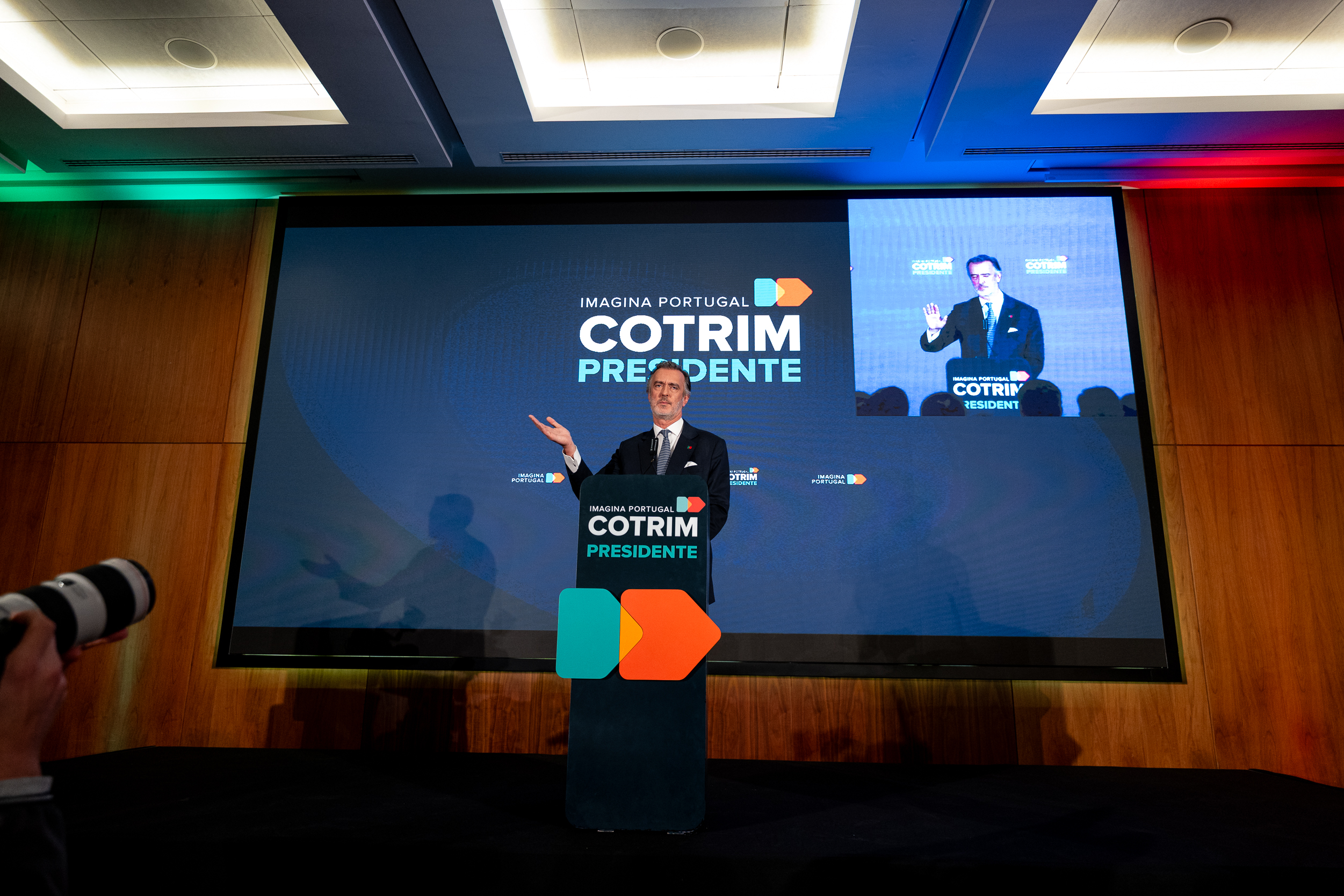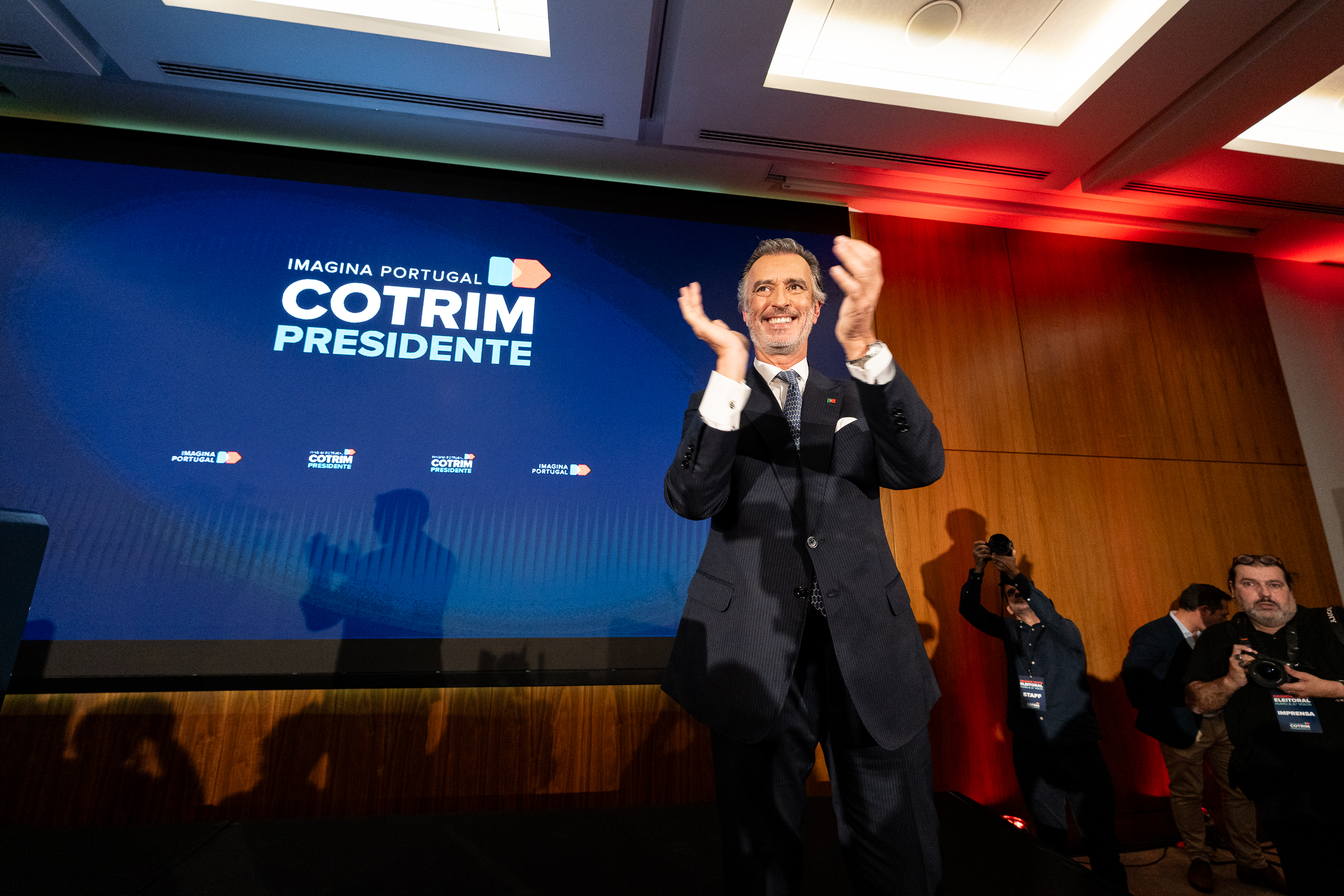 À frente de um, dos três, enormes plasmas e enquadrado (tons de azul) entre a frase “Imagina Portugal Cotrim Presidente”, lançou farpas ao campo político onde navega. A “provável” eleição de António José Seguro, uma “péssima escolha”, a par de André Ventura, tem um rosto e um nome. “Deve-se a um erro estratégico da liderança do PSD (assobios). Luís Montenegro não pôs o interesse do país à frente do seu partido”, disparou. Mais assobios.