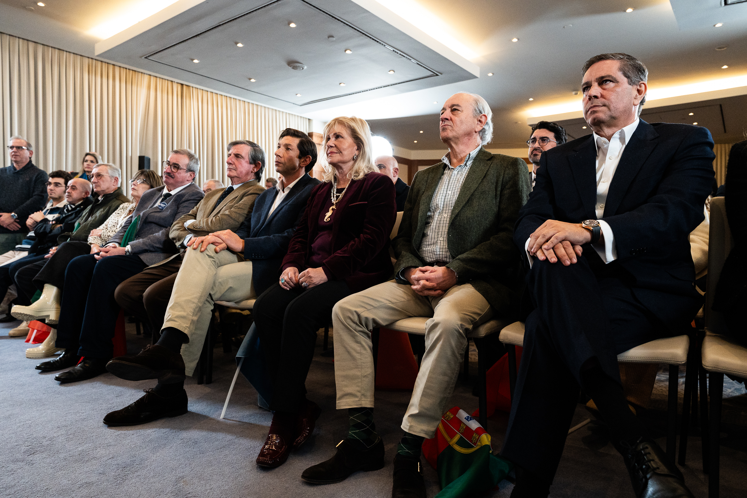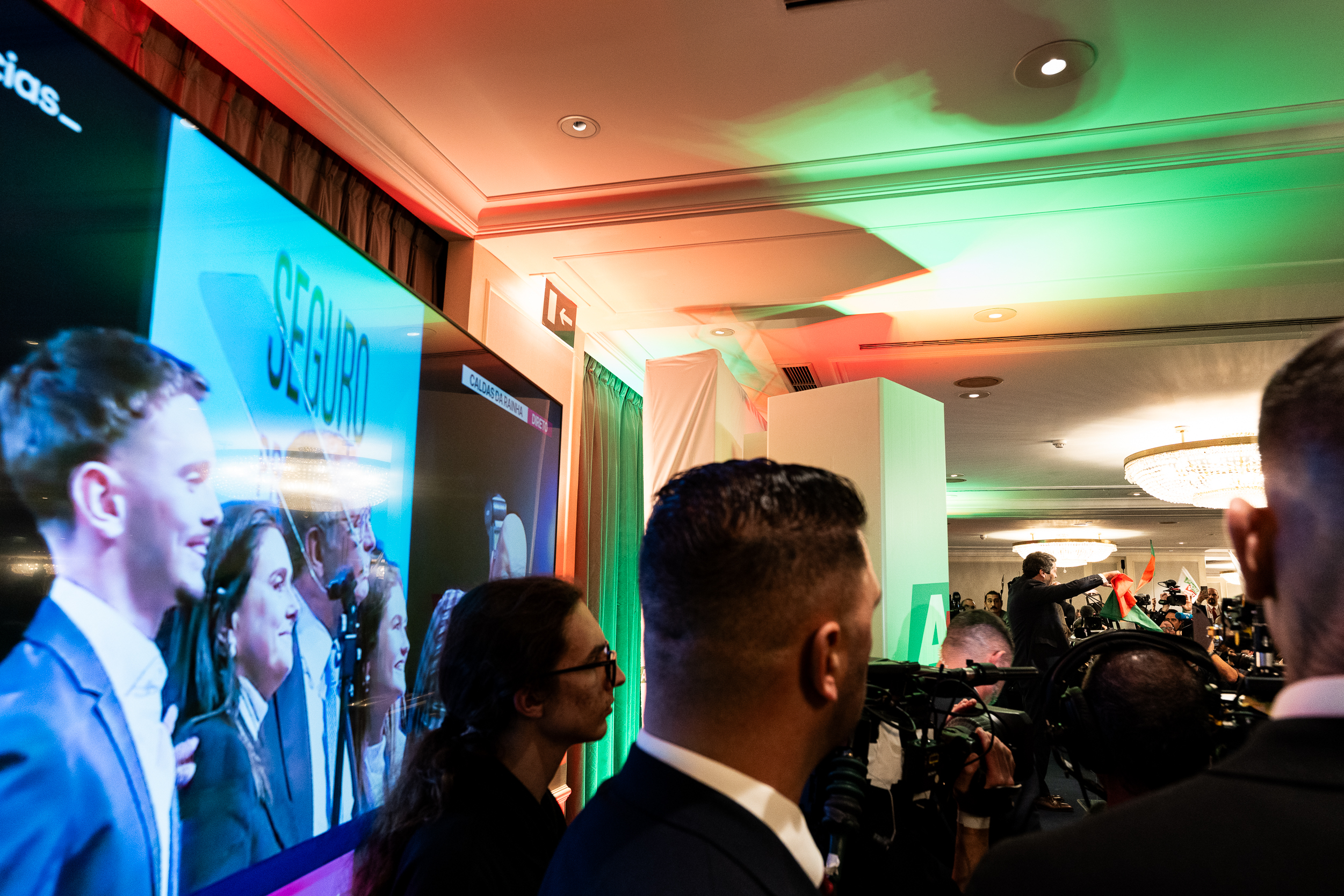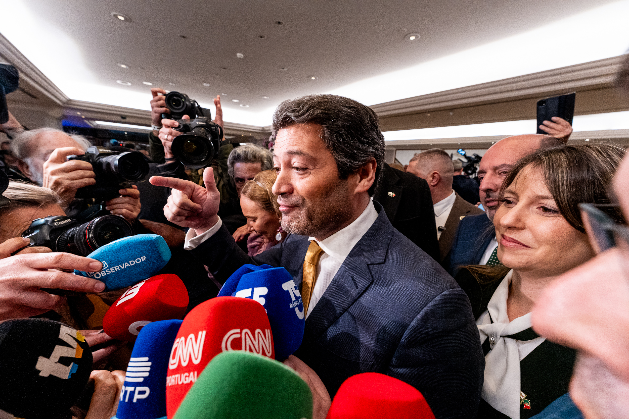 No Marriot, casa temporária do Mestre André, circulavam jotinhas vestidos a preceito e senhoras e homens de cachecol e bandeiras do Chega e de Portugal. Se à hora das projeções, os resultados (na altura Ventura e Cotrim estavam colados) foram recebidos com sorrisos tímidos, a chegada (20h45) de Ventura, acompanhado da mulher, em estilo estrela de cinema, serviu de primeira afirmação de poder do candidato.
