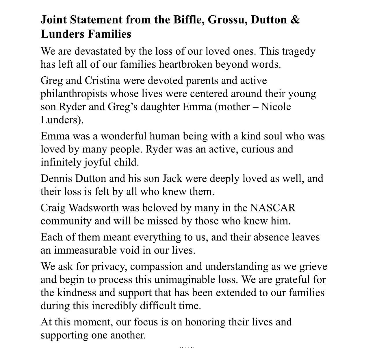 Numa atualização mais recente, as famílias dos envolvidos disseram em comunicado, a que o 24notícias teve acesso, que "estão devastadas com a perda dos seus entes queridos. Esta tragédia deixou a nossa família toda de coração partido. O Greg e a Cristina eram pais devotos (...) cuja vida era centrada nos seus jovens filhos Ryder e a filha do Greg, Emma (da mãe Nicole Lunders). A Emma era um ser humano com uma alma fantástica, amada por muitos. O Ryder era uma criança ativa, curiosa e com alegria infinita. Dennis Dutton e o seu filho Jack também era muito amados e a sua ausência será sentida por quem os conhece. Craig Wadsworth era amado por muitos da comunidade NASCAR e será sentida a sua falta".