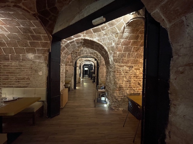Se as ferragens, pregos, talheres e mobiliário original da loja e uma peculiar máquina registadora decoram o piso superior, a prova gastronómica recomendada pelo Guia Michelin e Guia Repsol decorre no subsolo, debaixo de abóbadas de tijolo do século XVI, terrenos outrora ocupados pelas caves do Real Colégio de Nossa Senhora de Loreto.