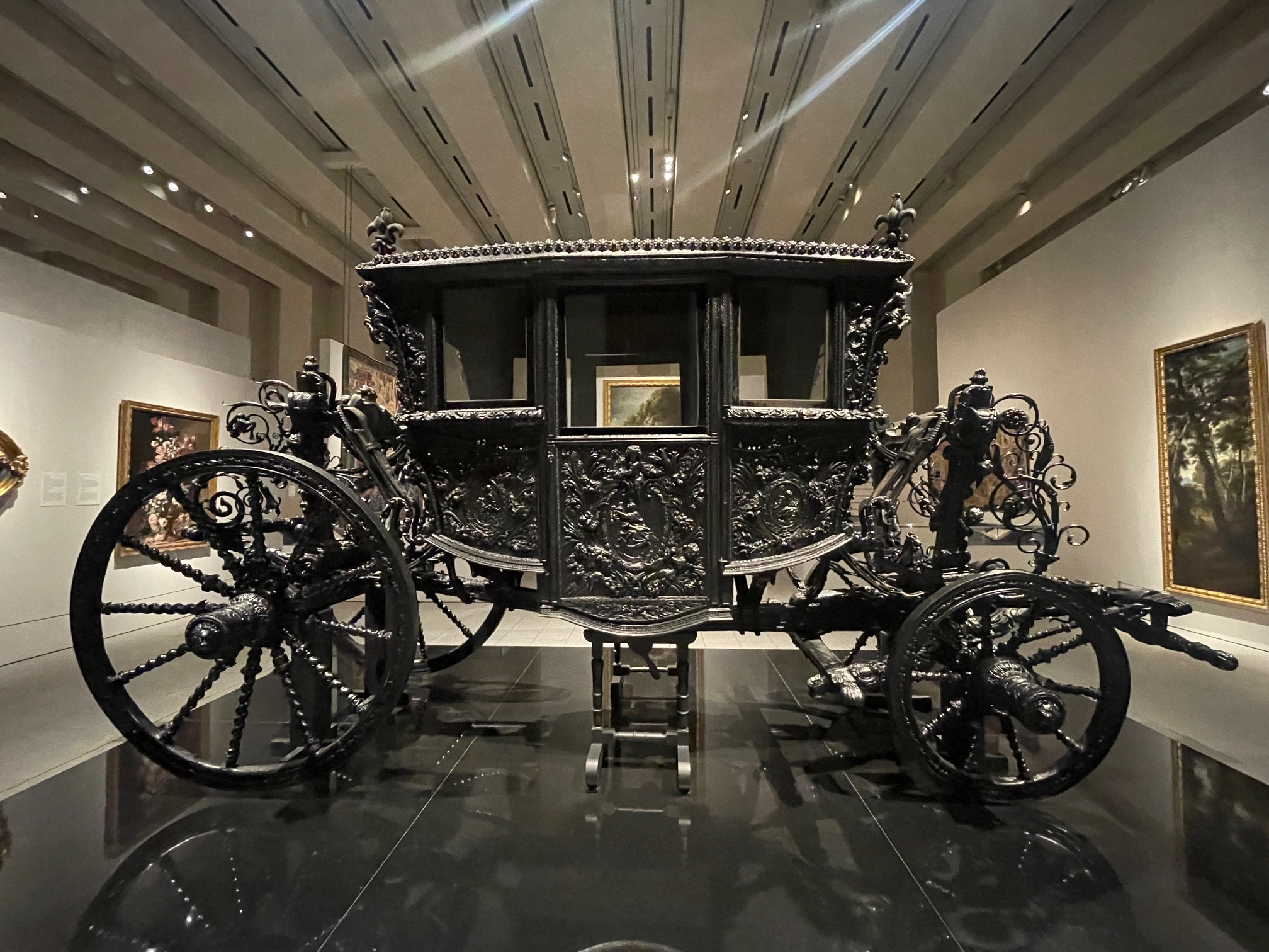 Pintura de mestres como Velázquez, Goya, Caravaggio, El Greco, esculturas, tapetes, livros, documentos, instrumentos musicais, carruagens e joias reais, armas e armaduras estão alinhados ao olhar de um qualquer plebeu.