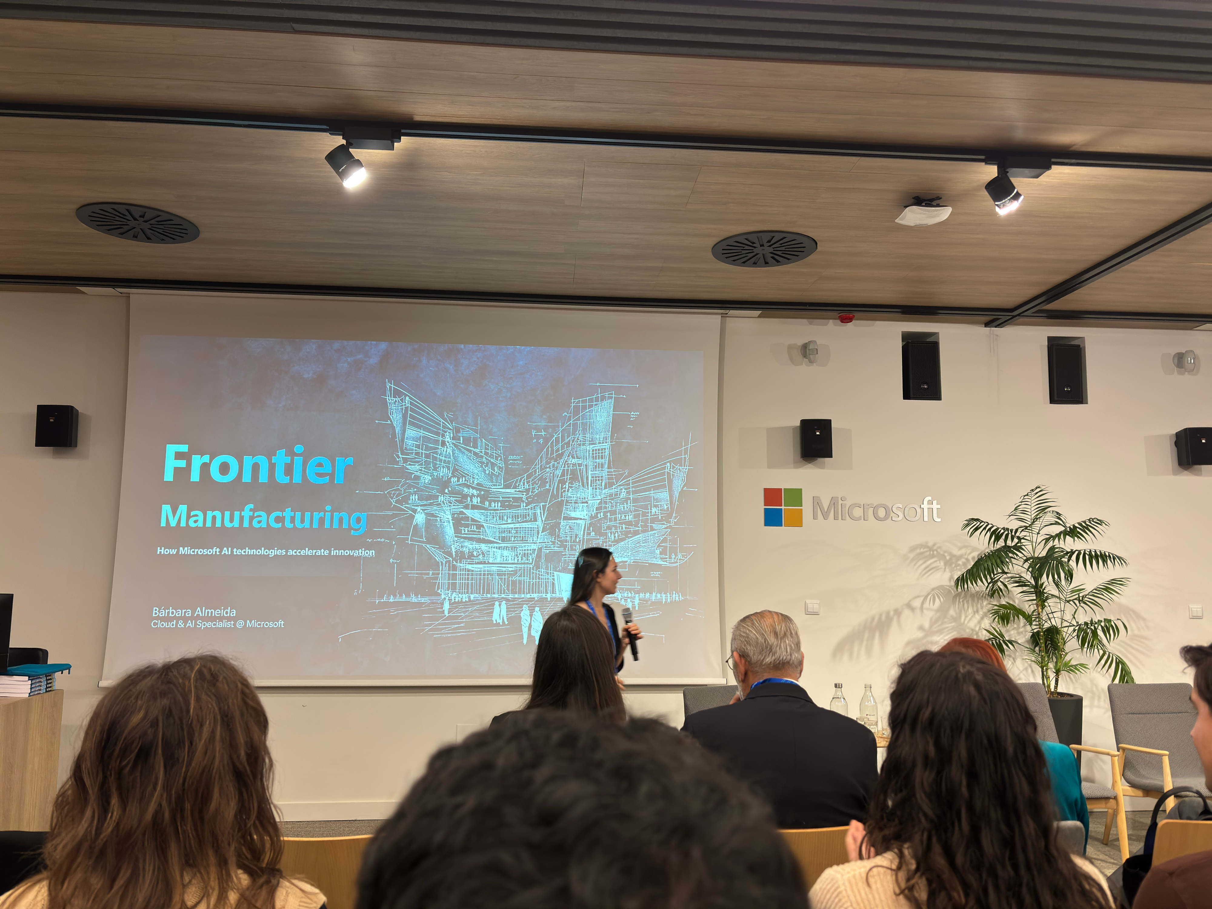 A segunda lightning talk, por Bárbara Almeida, especialista Digital Azure da Microsoft, explorou o conceito de “empresa do futuro”: a passagem de um desenvolvimento tradicional para um modelo assente em IA. Recordando que a IA não é uma novidade, existe desde os anos 60, mas que a grande viragem ocorreu com os modelos conversacionais e a popularização de ferramentas como as da OpenAI, que colocaram o tema no centro da discussão pública. Referiu a visão da Indústria 5.0 (conceito que complementa a Indústria 4.0, focando na colaboração entre humanos e máquinas, colocando o ser humano no centro do processo produtivo): human-centric, mas AI-first, com o ser humano como orquestrador apoiado pela inteligência artificial. Partilhou também a perspetiva da Microsoft, que considera a IA “a nova eletricidade”, capaz de gerar toda uma nova cadeia de valor e novas indústrias, tal como aconteceu na revolução elétrica.
