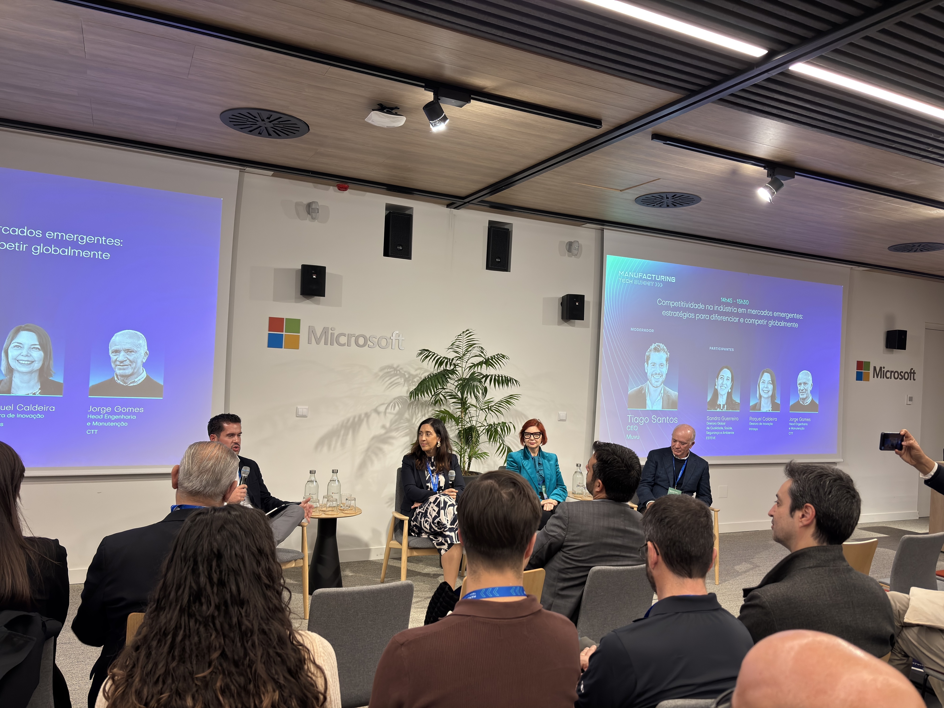 O painel moderado por Tiago Santos reuniu três especialistas — Sandra Guerreiro (ESTEVE), Raquel Caldeira (Introsys) e Jorge Gomes (CTT) — para discutir inovação tecnológica, competitividade e transformação industrial. A conversa evidenciou que a adoção tecnológica é um processo complexo, que exige mais do que implementar ferramentas: requer mudança de mentalidade, desenvolvimento de competências e envolvimento contínuo das equipas. No setor farmacêutico, a diretora de qualidade da ESTEVE (empresa farmacêutica internacional espanhola) que projetos só avançam quando mindset, skillset e toolset evoluem em conjunto, como demonstrado pelo sucesso do One Button Batch Release (processo frequentemente associado a softwares que automatizam a aprovação final de um lote de produtos com uma única ação.)