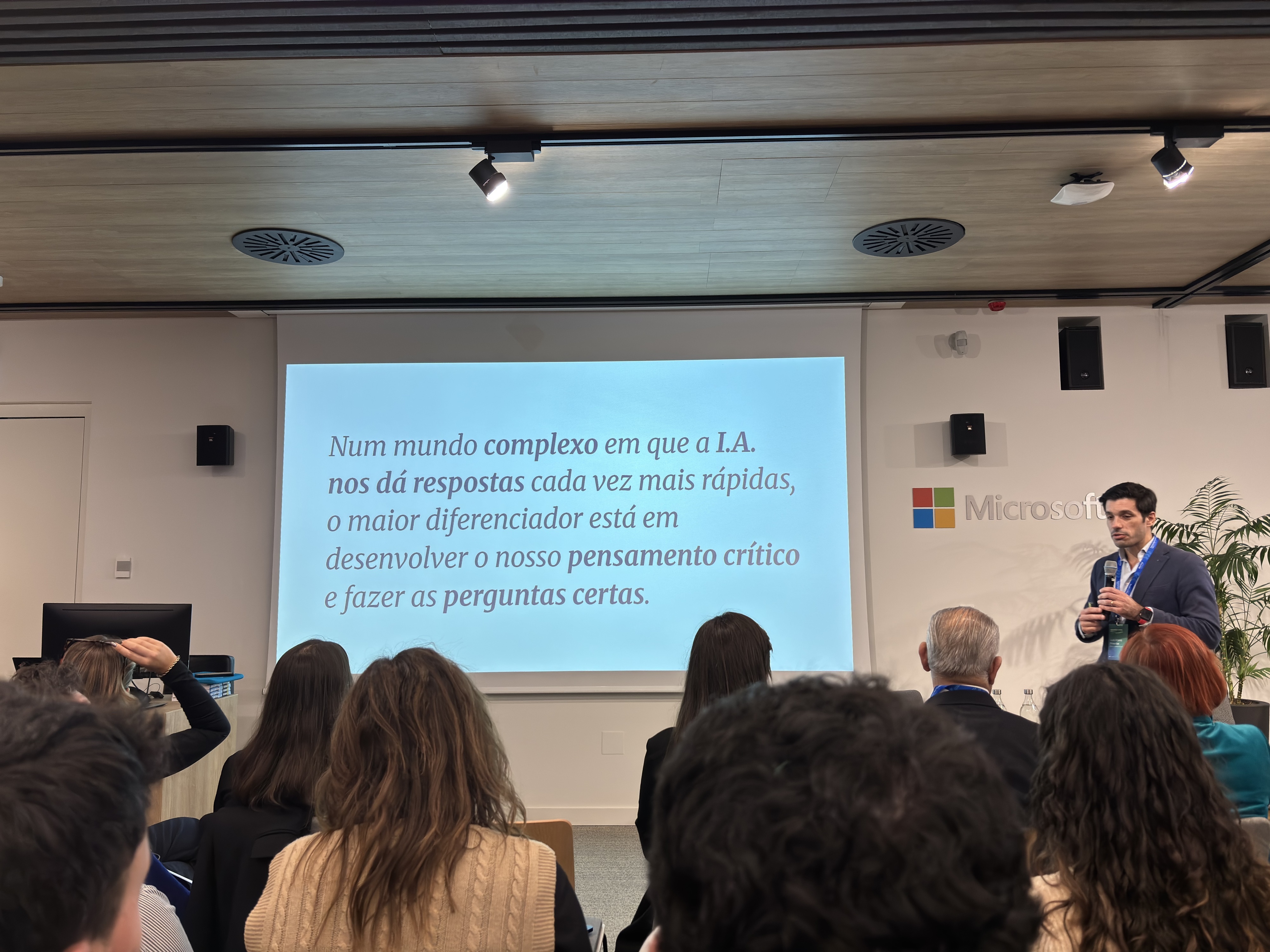 Além disso, sublinhou a importância do pensamento crítico, da capacidade de união e da supervisão humana (human on the look), evocando a ideia de “pensar devagar”, de Daniel Kahneman, como equilíbrio entre trabalho rápido e reflexão profunda. Citou ainda Daniela Braga: “mais filósofos, menos programadores”, reforçando que precisamos de compreender o que as pessoas pensam e não apenas o que os sistemas produzem. O operador receia perder o emprego, o CEO procura onde melhorar o negócio. A tecnologia tem de servir ambos.