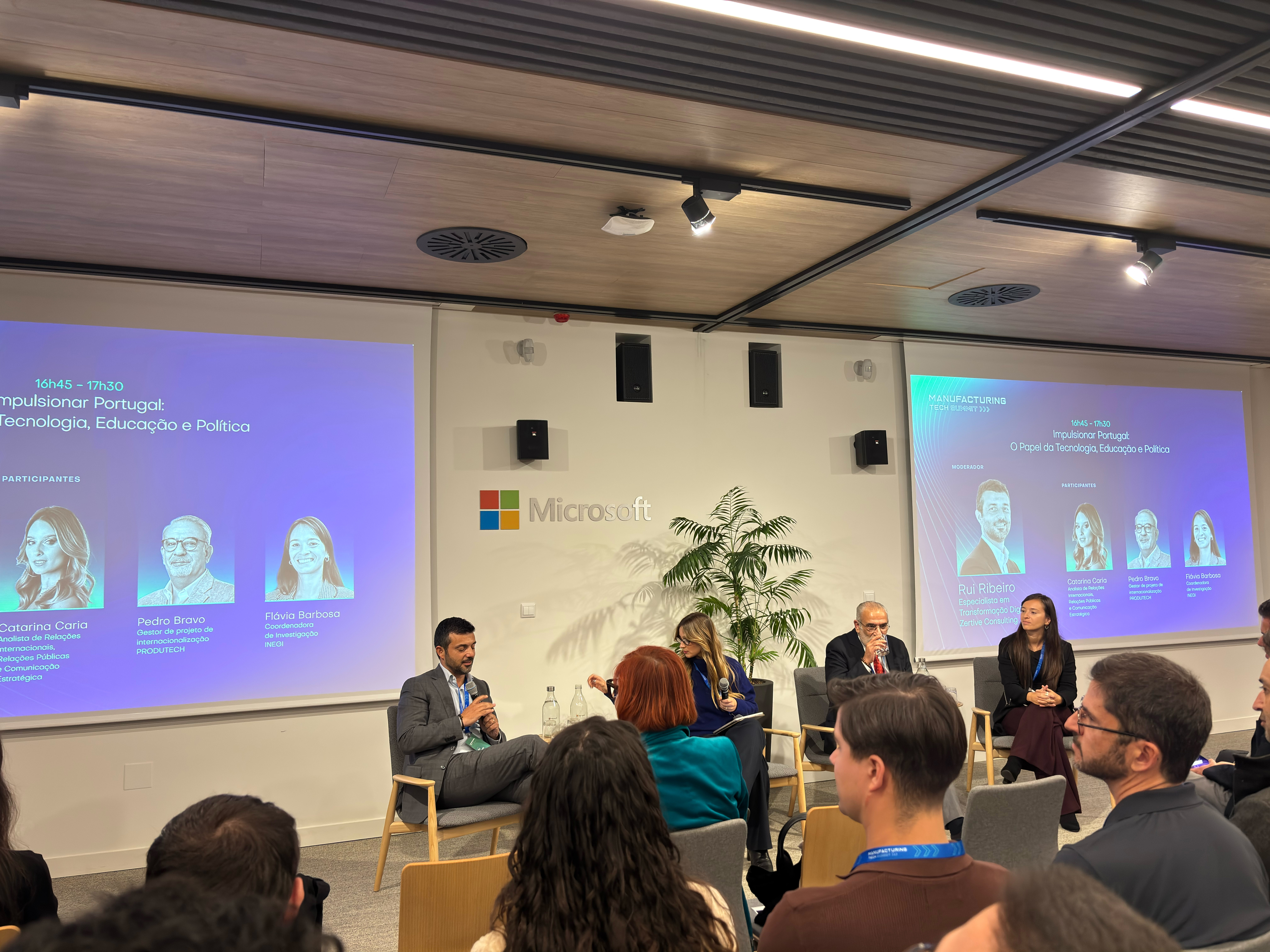 No painel seguinte, com Catarina Caria (Analista de Assuntos Internacionais), Pedro Santos (Gestor de Projeto na PRODUTECH) e Flávia Barbosa (Coordenadora de Investigação no INEGI), moderado por Rui Ribeiro (Especialista em Transformação Digital na Zertive Consulting), discutiu-se a necessidade de a Europa assumir um papel mais ativo na política industrial, num mundo que passou de bipolar para tripolar. Catarina Caria destacou que crises, guerras e ruturas das cadeias de valor apenas tornaram urgente aquilo que já era evidente: a fragilidade europeia na indústria de defesa. Portugal, tradicionalmente dependente de Bruxelas para defesa, matérias-primas críticas e parcerias estratégicas, nunca desenvolveu uma base industrial robusta, um risco hoje inegável. A dependência de materiais críticos, o choque energético e episódios como grandes apagões tornaram visíveis vulnerabilidades estruturais, agravadas por ameaças híbridas e cibernéticas, reforçando a necessidade de maior resiliência digital.
