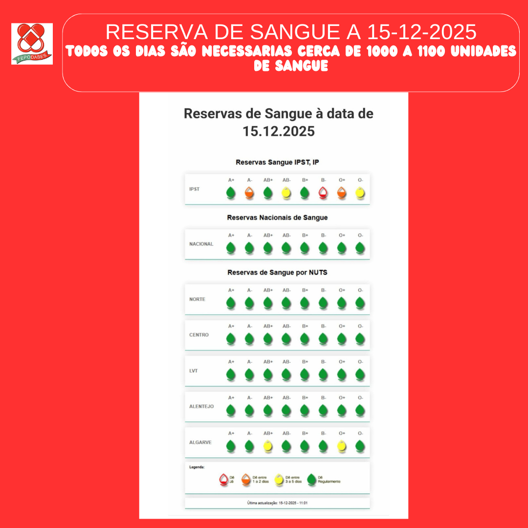 A campanha surge num contexto considerado preocupante, após a divulgação recente dos níveis de reserva de sangue do Instituto Português do Sangue e da Transplantação (IPST). Segundo a FEPODABES, é urgente reforçar os stocks para evitar que tratamentos de alguns doentes possam ficar comprometidos. O apelo incide, em particular, nos grupos sanguíneos O+, O–, B– e A–.