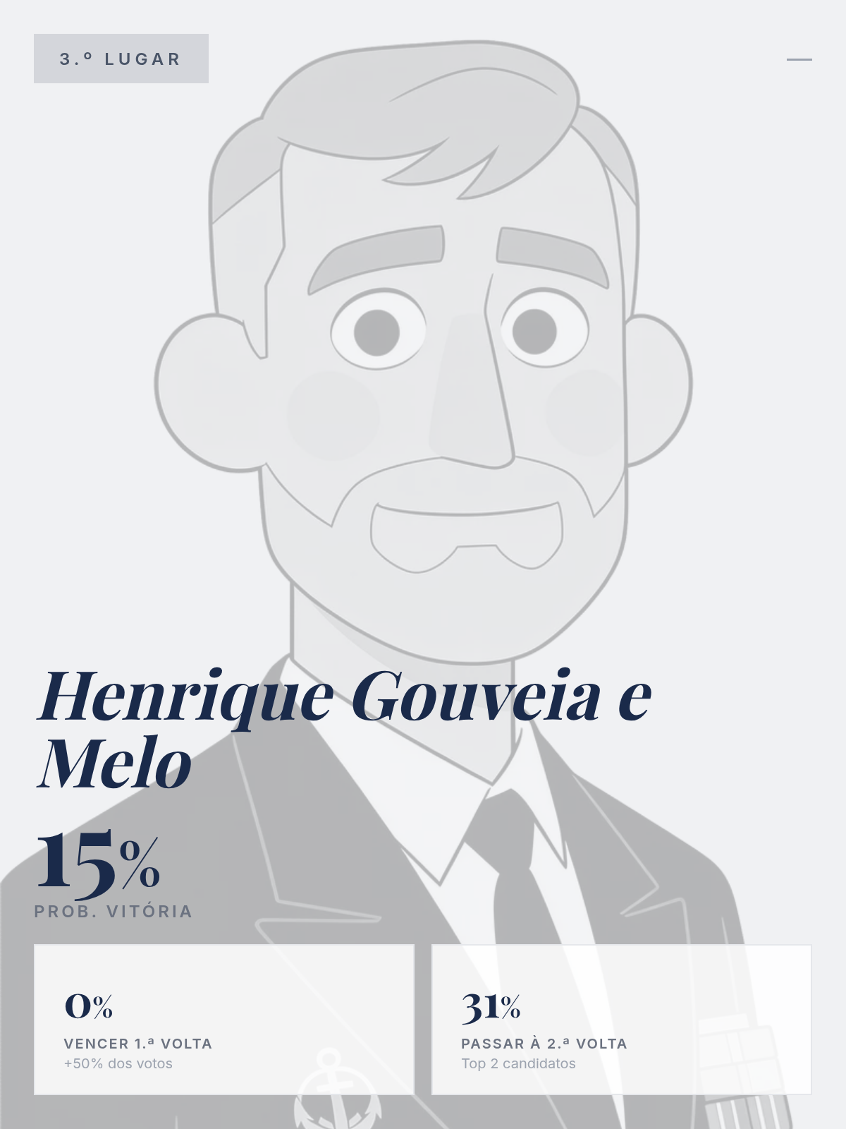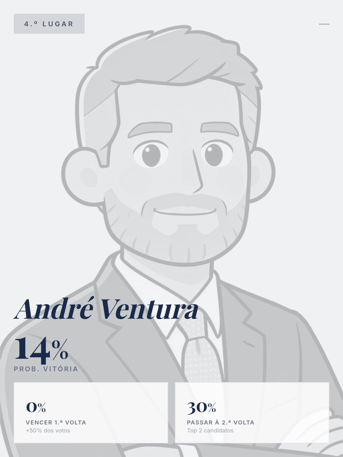 André Ventura, líder do Chega, recupera terreno após semanas menos favoráveis, com 14,3% de probabilidade de vitória, enquanto Henrique Gouveia e Melo, o almirante que chegou a ser apontado como favorito, caiu para 15,2%. Mais atrás, Luís Marques Mendes regista 14% nas sondagens, mas apenas 3,3% de probabilidade de vitória.