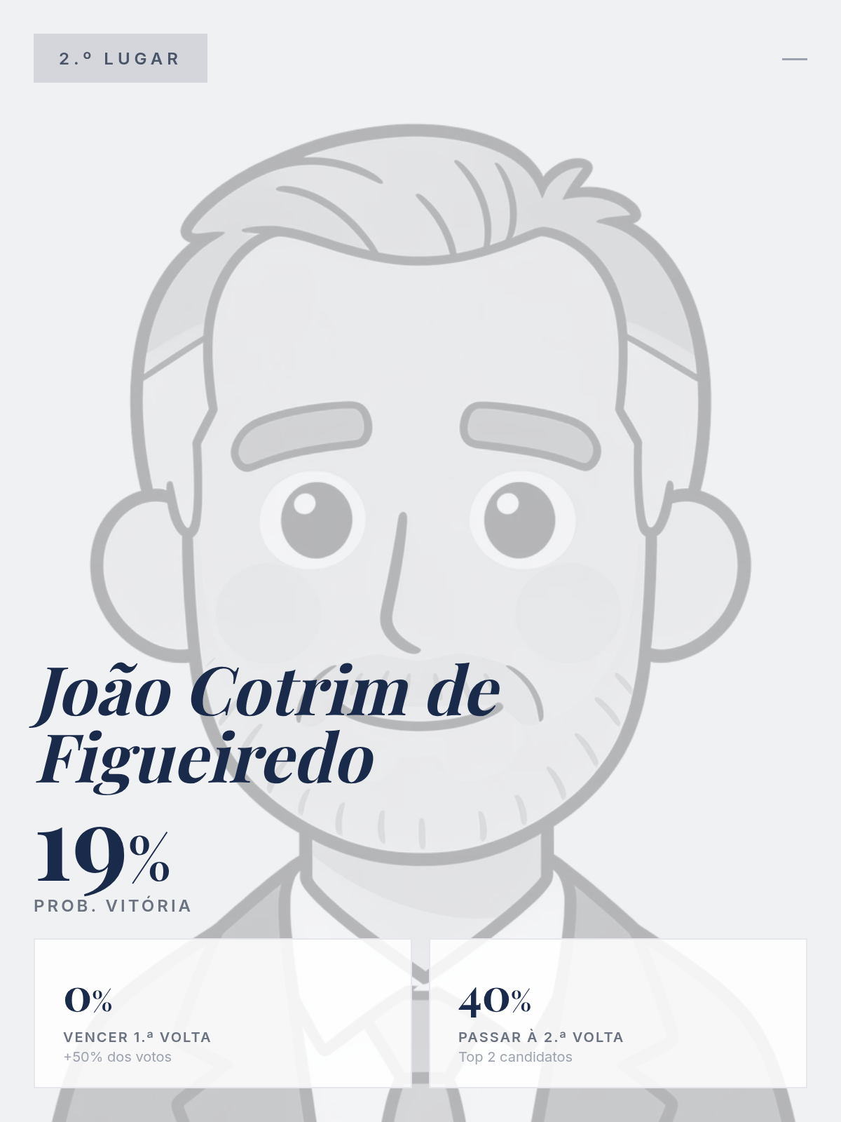 João Cotrim de Figueiredo surge como principal perseguidor, com 19,4% de probabilidade de vitória, mas a campanha do candidato da Iniciativa Liberal foi marcada por polémicas recentes. Declarações ambíguas sobre um possível apoio a André Ventura numa segunda volta e uma acusação de assédio negada pelo próprio levaram Cotrim a anunciar um processo por difamação, gerando críticas dos restantes candidatos.