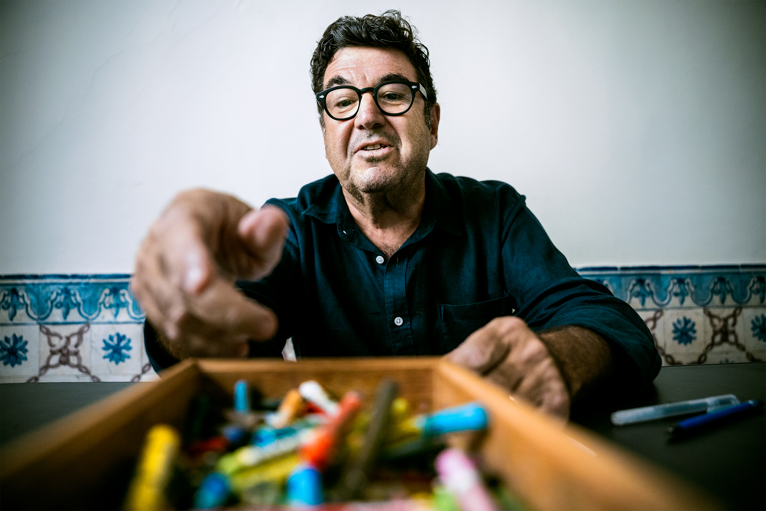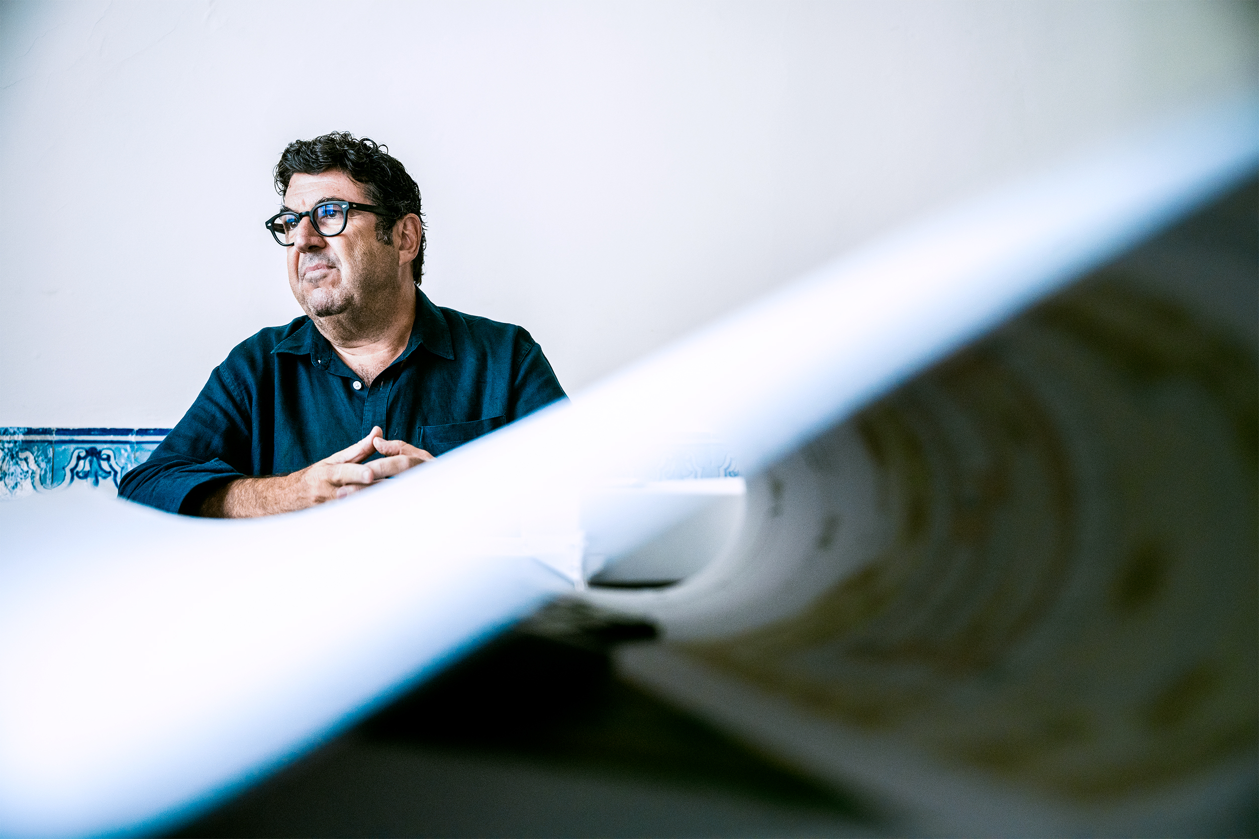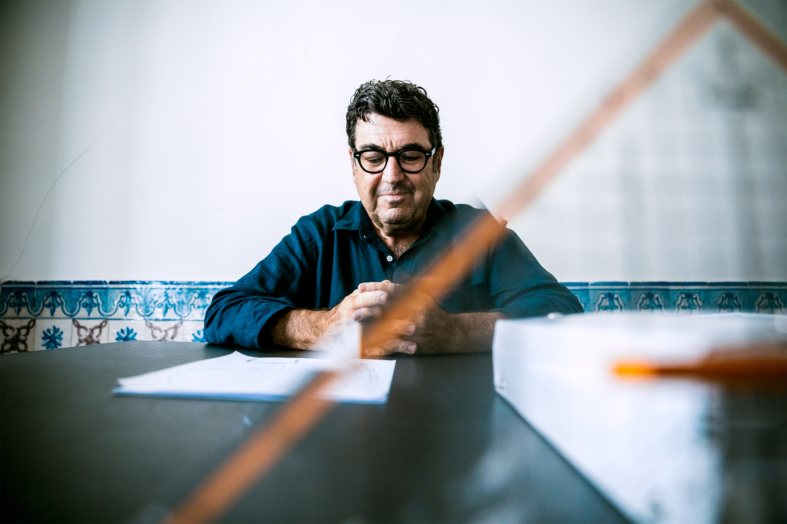 Encontrámo-nos no seu atelier na Rua do Alecrim, em Lisboa, onde trabalham cerca de dez pessoas, e quando entrei no seu gabinete, antes de começar a gravar a entrevista, desligou Rachmaninoff. Diz que não pode passar sem os lápis de cera Caran d'Ache ou o rolo de papel vegetal onde faz os seus esquissos, mas a música é essencial enquanto trabalha.