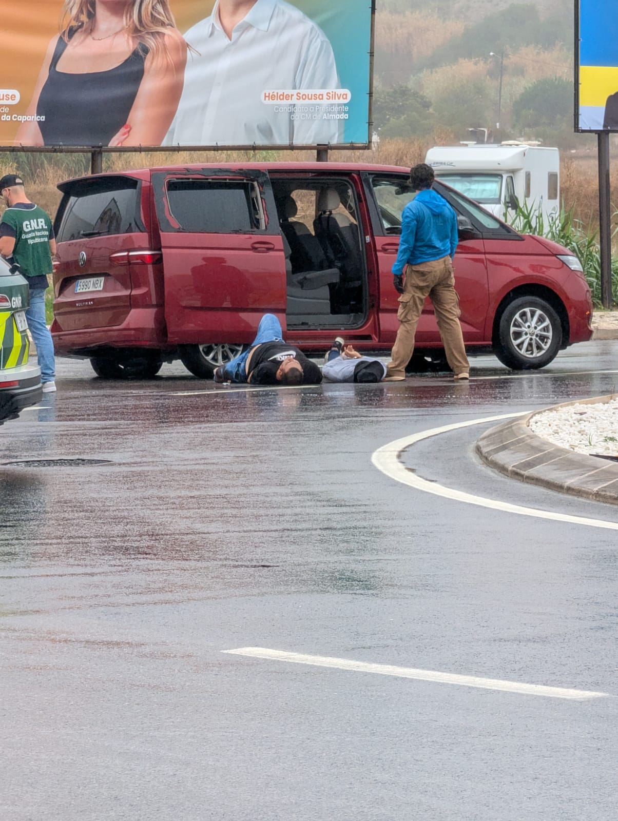 Por volta das 10h00, a PSP pediu apoio à GNR da Costa de Caparica, por se tratar de uma área sob jurisdição da guarda. Durante a fuga, a carrinha entrou em contramão, colocando em risco a segurança de outros condutores. O 24notícias sabe que, no local, foram efetuados vários disparos e que os pneus da viatura foram furados, tendo a carrinha sofrido também danos nos vidros. Foi nesse momento que um militar da GNR disparou, atingindo de raspão o condutor na perna.
