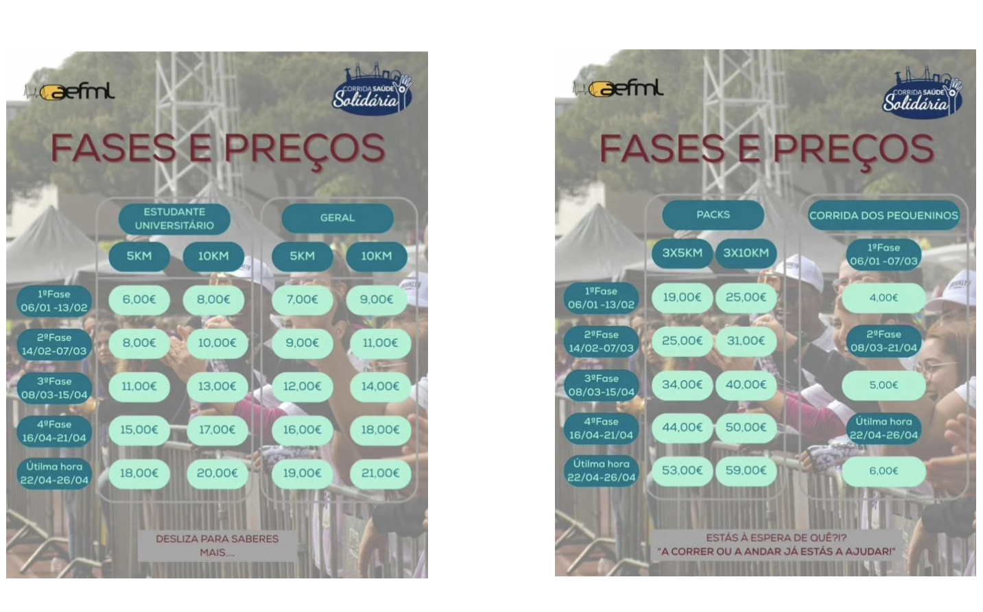 As inscrições decorrem até ao dia da prova, estando divididas em cinco fases com valores progressivos, diferenciados entre estudantes e não estudantes. Os primeiros 100 inscritos beneficiam de um desconto de um euro.