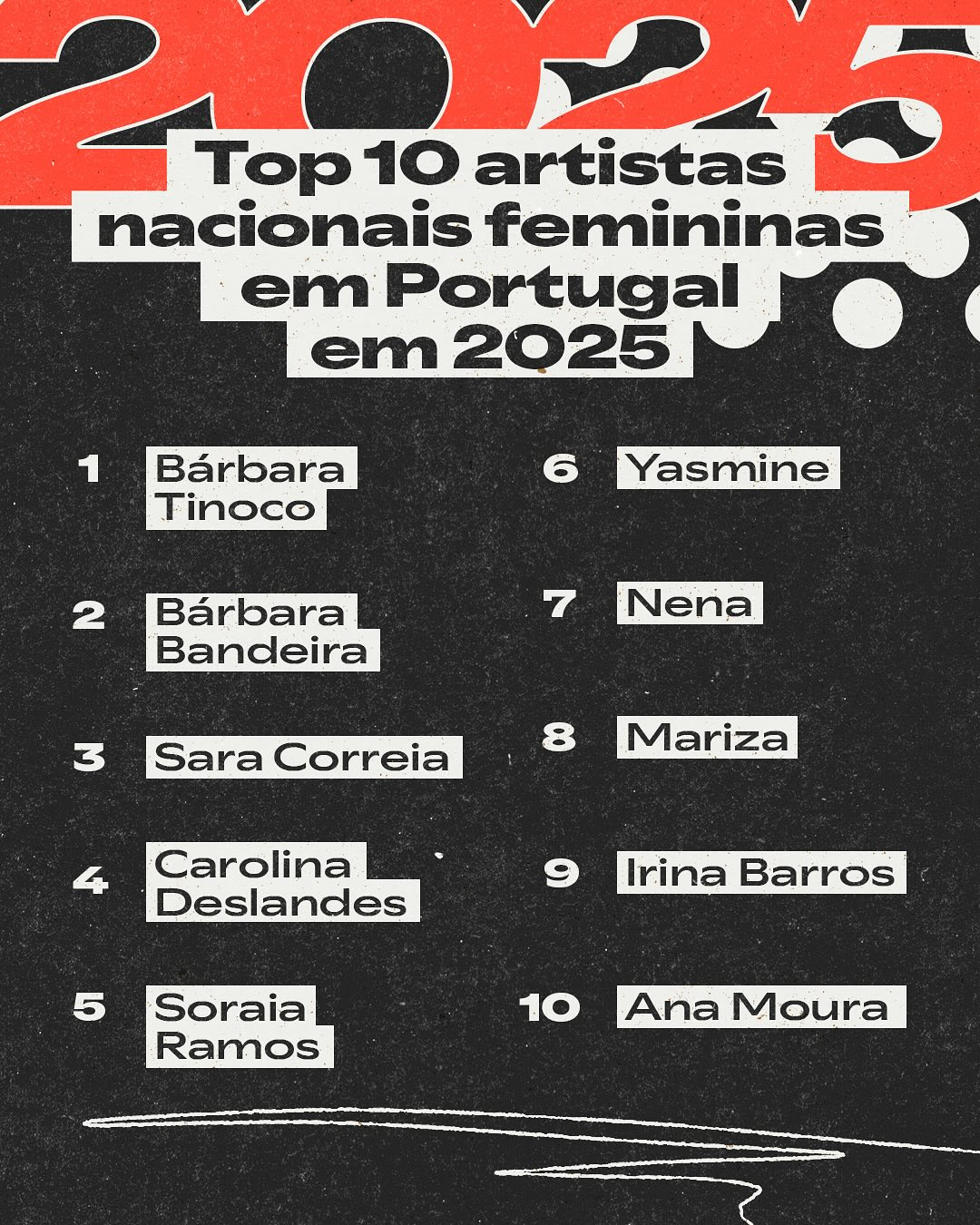 Também Nena teve um ano de ascensão. A artista, que se estreou em nome próprio no Sagres Campo Pequeno esgotado em outubro de 2025, entrou no top 10 das artistas femininas portuguesas mais ouvidas no Spotify. O resultado surge no mesmo ano em que lançou o álbum “Um Brinde ao Agora”, um dos discos nacionais de maior impacto comercial em 2025.